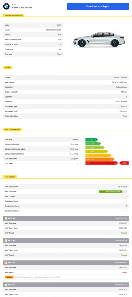 - MOT History: Complete MOT test records, pass/fail outcomes, advisory notes, and detailed results.